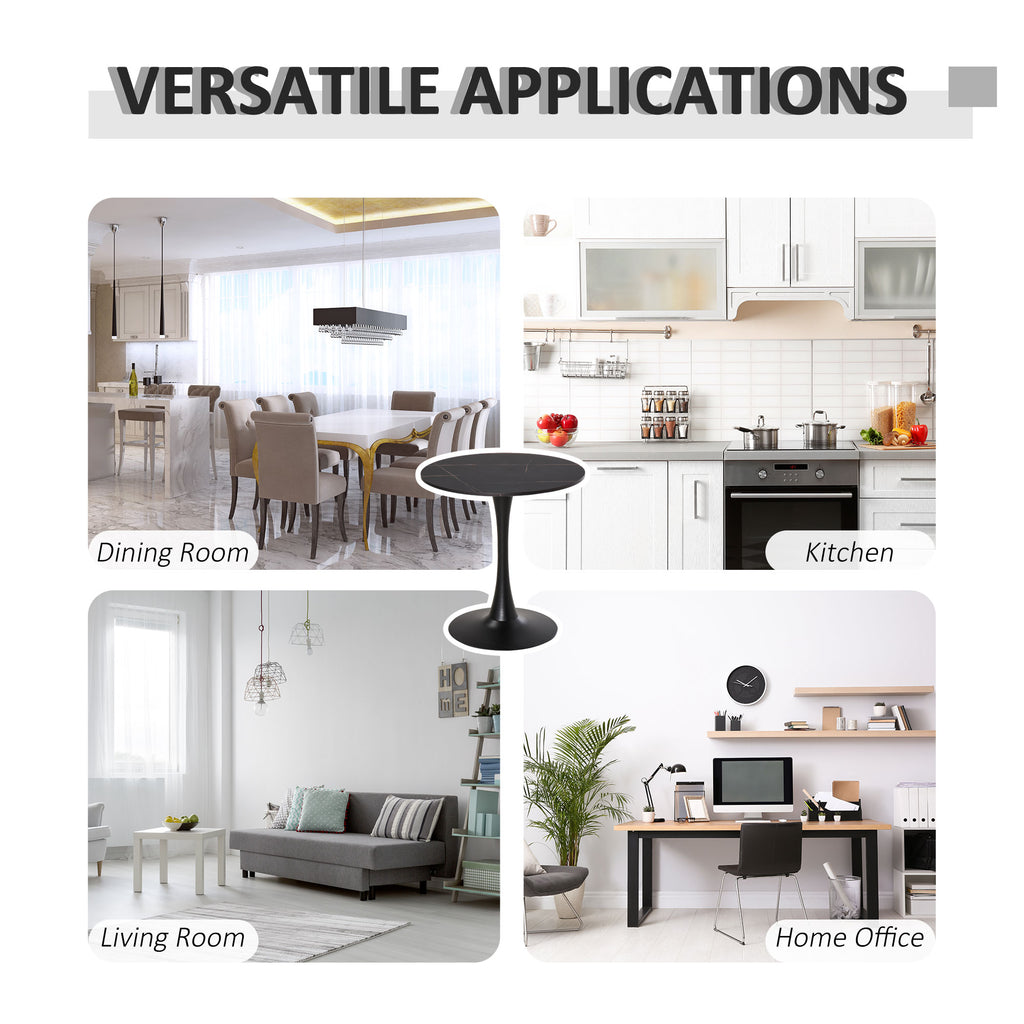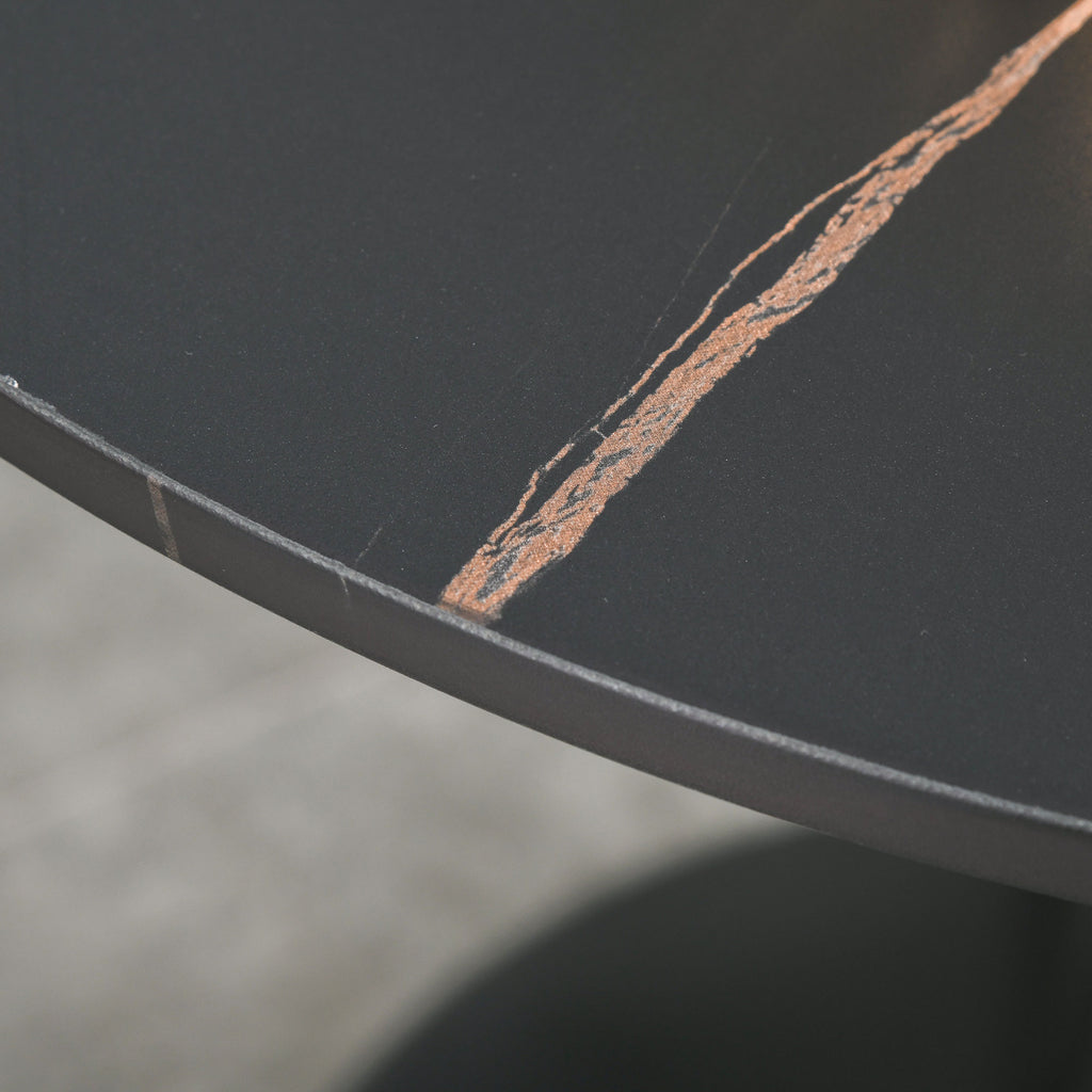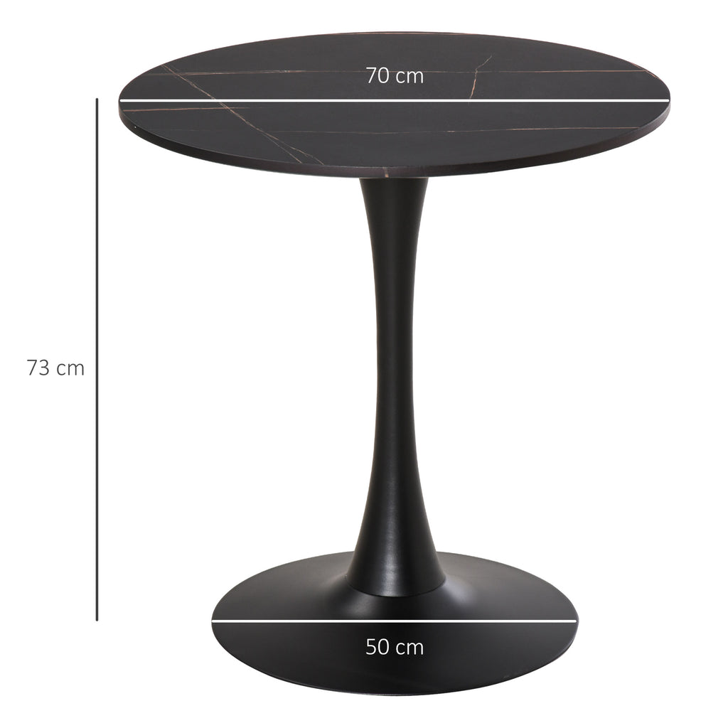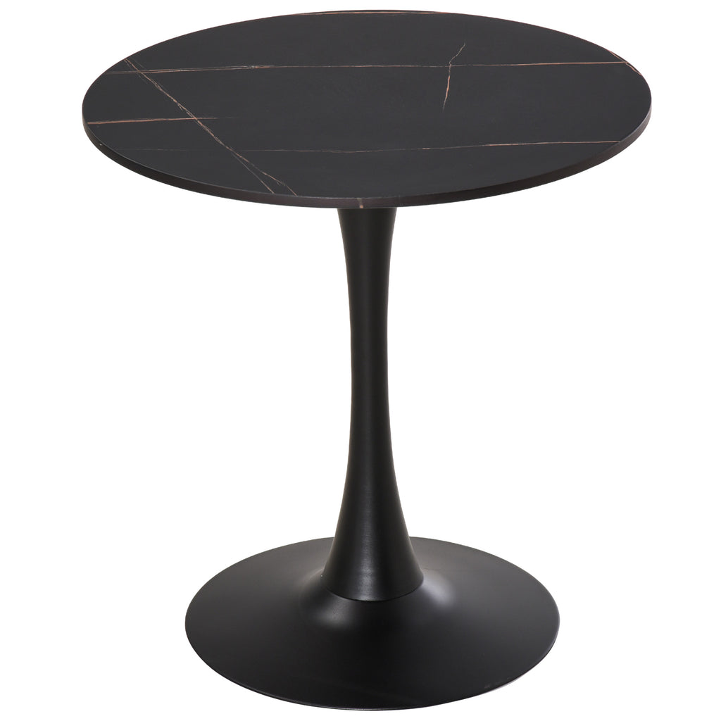 Bring upmarket bar vibes into the home with this dining table The frame, made from metal for a strong base, is crafted into a smoothly curved hourglass shape, giving it a beautiful look and feel. A large round table top is fitted on the frame, giving you a safe and reliable holding place for glasses, plates and more. Covered in a faded marble effect finish for a unique look which complements almost any interior, it's finished with a round base to promote balance and a bottom pad to protect the floor.