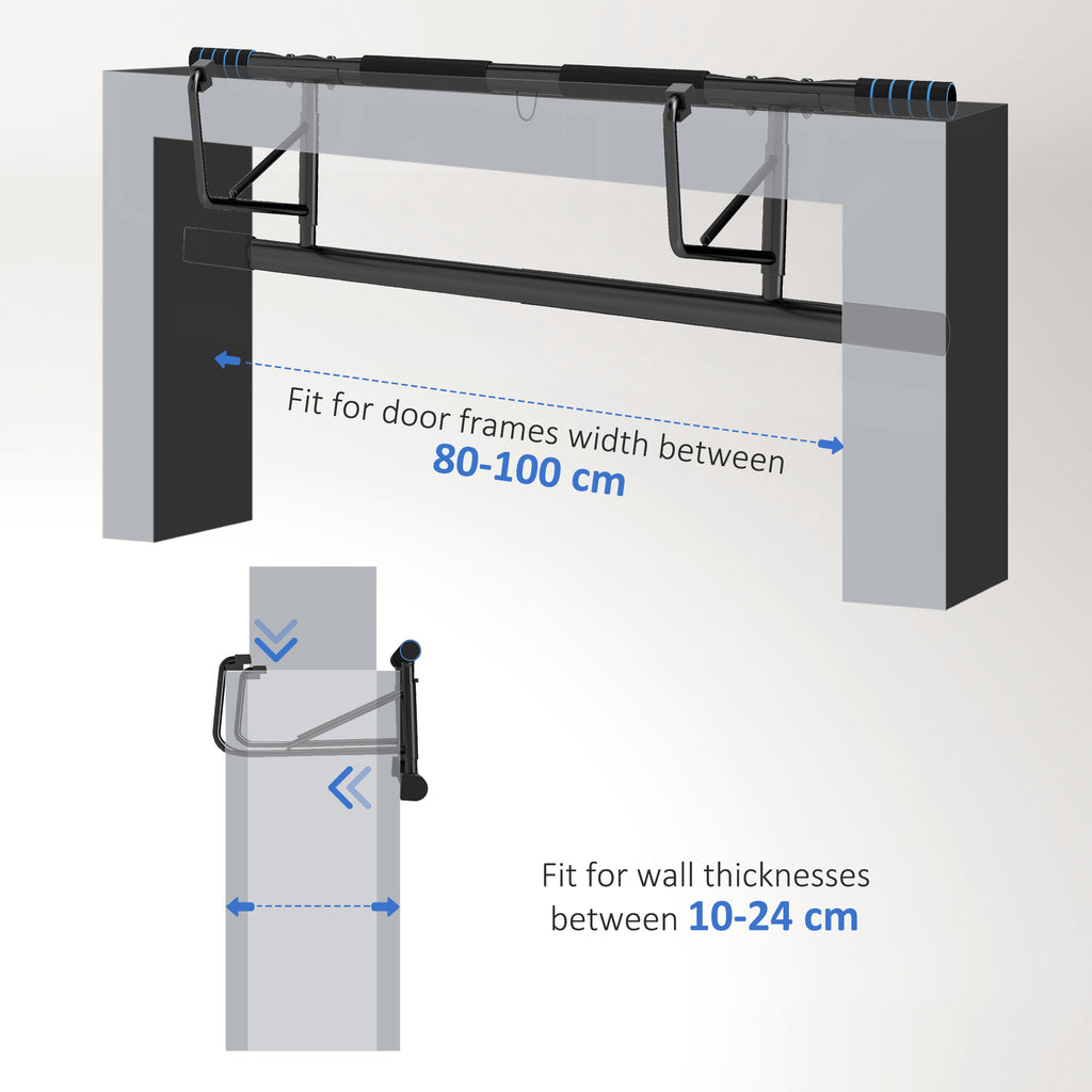 Transform your doorway into a fitness hub with the Pull-Up Bar! This installation-free gym bar easily hangs on door frames (80-100 cm wide) and is great for pull-ups. Crafted from robust steel and featuring comfy EVA foam handles, it's your go-to for a solid workout at home. Includes resistance bands to amp up your routine!