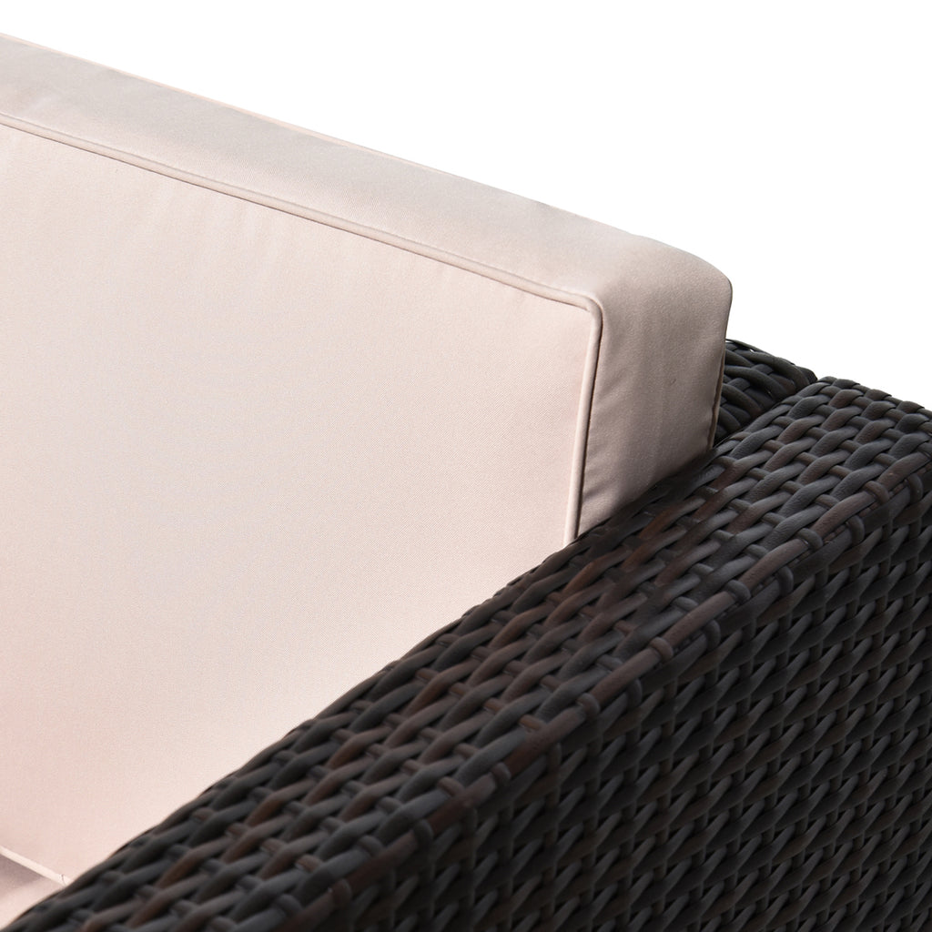 Sit back and relax in the comfort of your own garden with this three-piece chair and table set . Made from high-quality, hand woven PE wicker rattan with a metal frame underneath, each piece is extremely stable, reliable and low maintenance. Also weather resistant, this set is suitable for use all year round and has been made with comfort in mind, thanks to the padded cushions, high rise back and wide seats – perfect for curling up and relaxing away the day in the sun. A thick tempered glass top on the table adds a sleek finishing touch that’s easy to look after. It’s ideal for catching up with a friend whilst the sun shines down on you both.