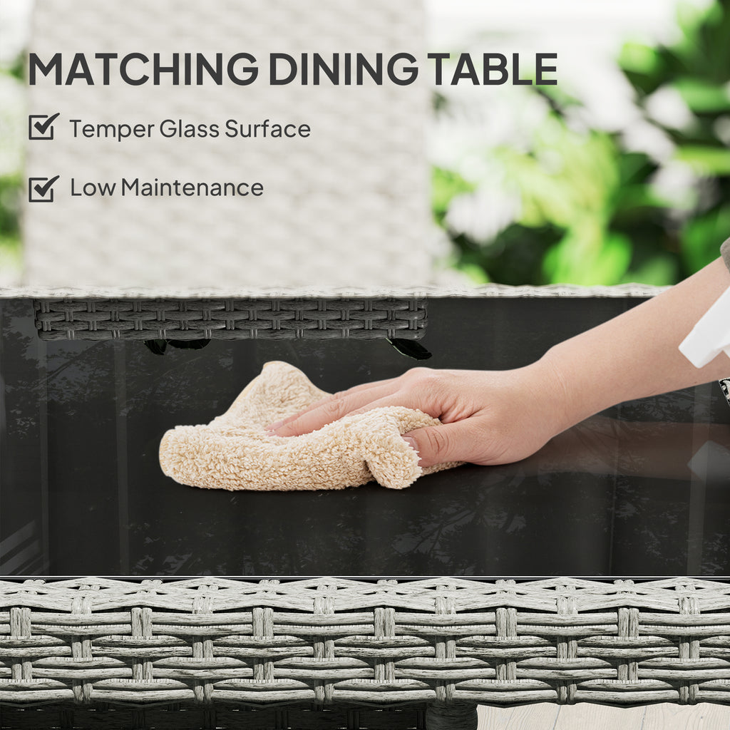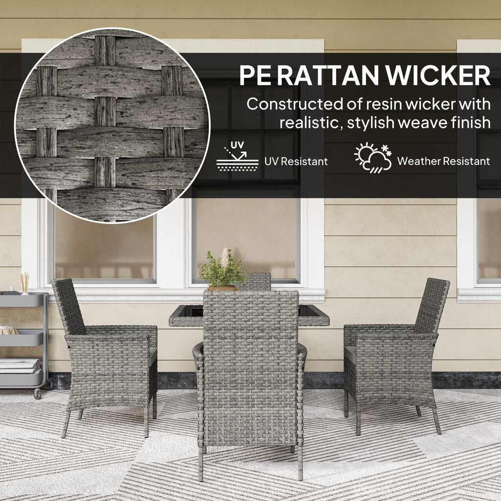 Enjoy alfresco dining with the rattan dining set, a charming addition to any outdoor space. This 5-piece garden dining set, featuring four cosy chairs with washable cushions and a sleek table, promises comfort and style. Crafted from all weather double-strand half-round PE rattan with a robust steel frame, it's designed to weather the elements, making it a staple for any garden table and chairs collection.
