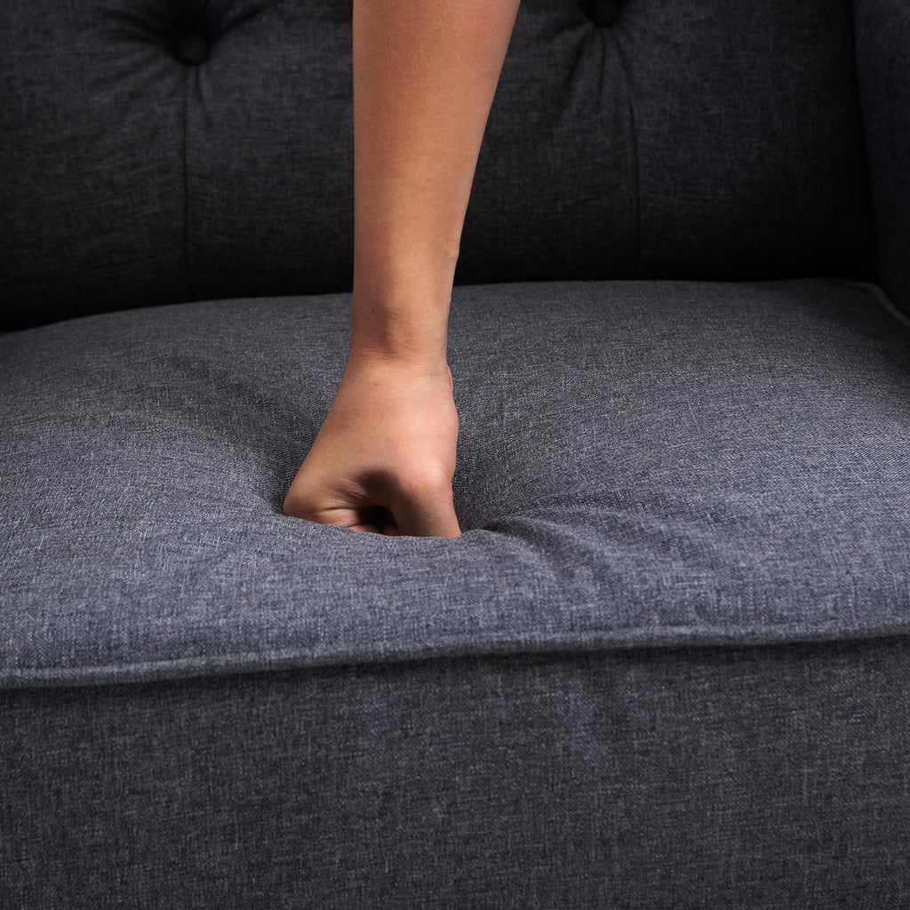 Take your relaxation to the next level with this recliner armchair. Made from a blend of metal and wood, making the recliner chair durable and reliable. Tufted on the back for a vintage and traditional look to decorate your home. Fitted with thick sponge on the seat, combined with 150° reclining angles, our chairs for living room provide you hours of comfortable support. It’s finished with linen upholstery for easy maintenance and four solid wood legs to keep it stable on the floor.