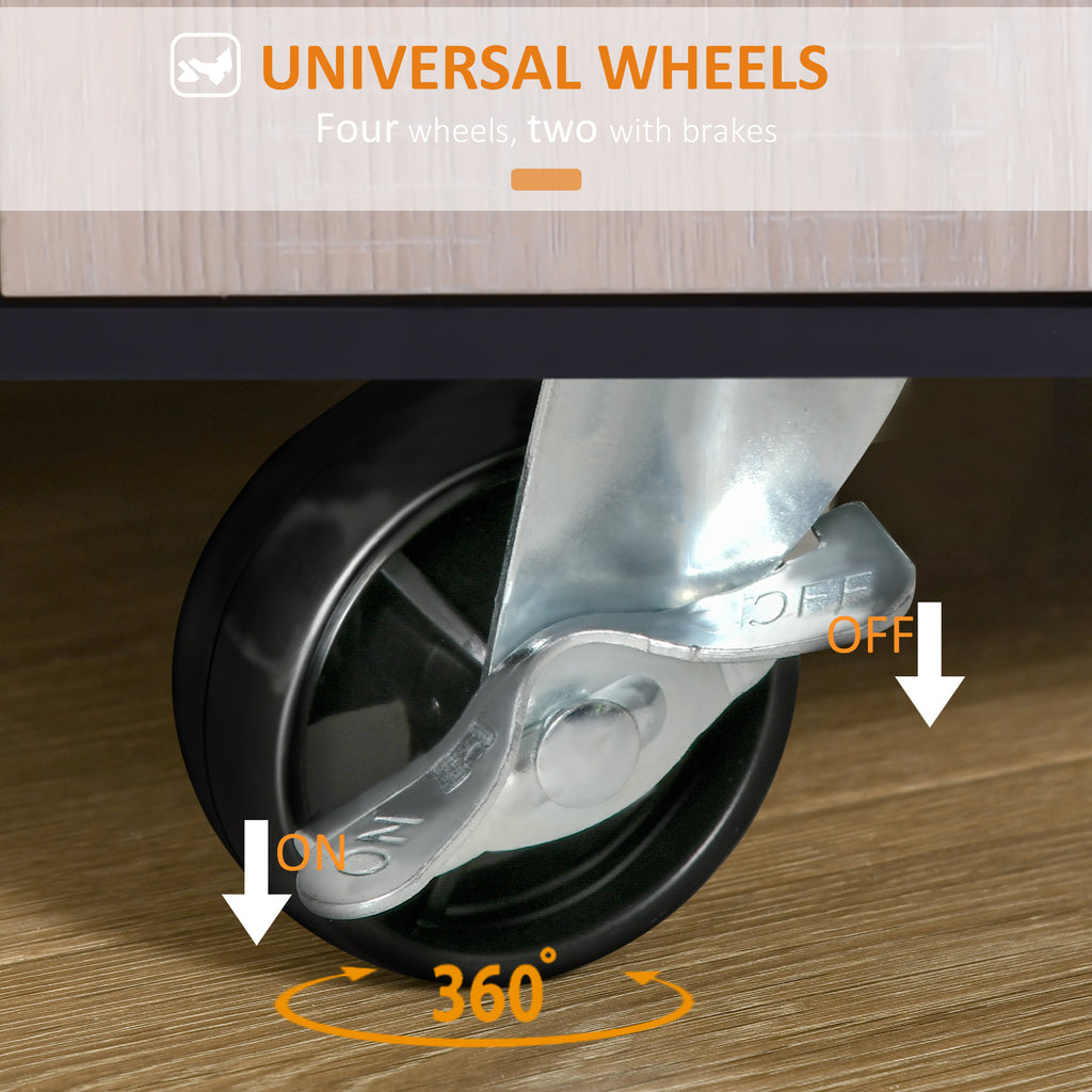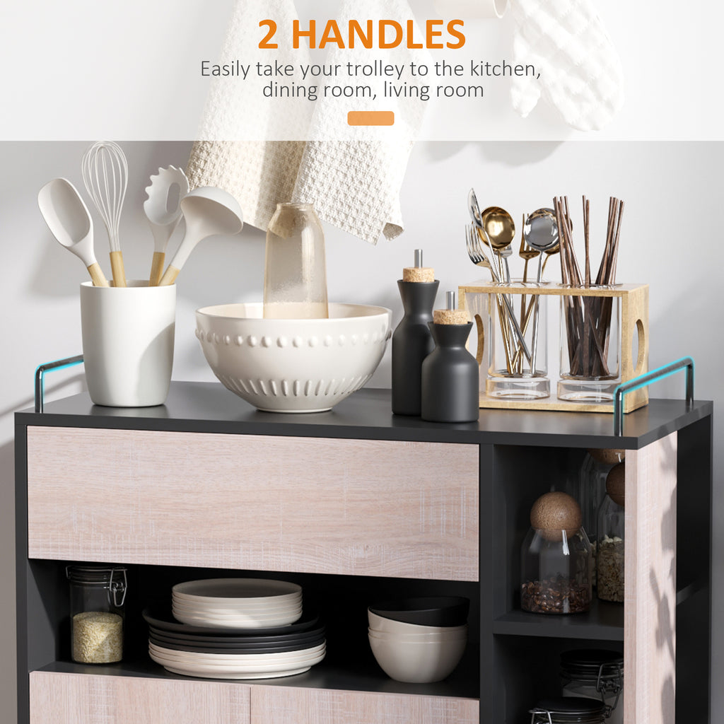 This versatile rolling kitchen trolley and serving cart from is perfect for your home. With 1 worktop, 1 drawer, 1 compartment, 1 cupboard and 3 storage shelves, this wood kitchen trolley offers lots of storage space for various utensils. It can be used as an island within your kitchen or for added storage in the bathroom, dining room, garage, laundry room, nursery, or the bedroom. Add a modern natural touch to your home with this classic 3-tier rolling kitchen trolley cart !