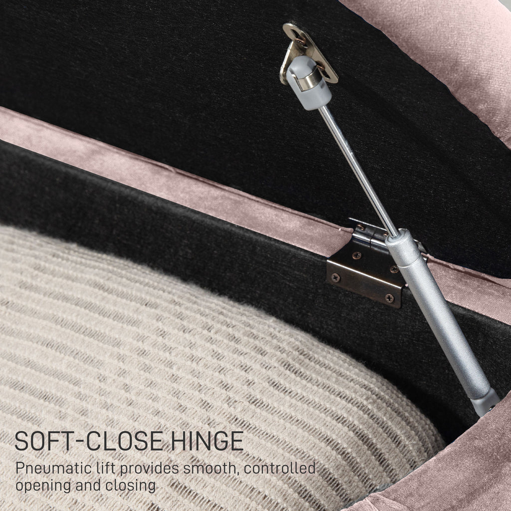 Create an instant focal point in your house with this french-inspired storage ottoman. Lush velvet-feel upholstery, carved wooden legs and button tufting add extra beauty to the design. The cushioned top lid allows you to sit comfortably when temporarily needed, finished with a 111.5 x 37.5cm storage space.