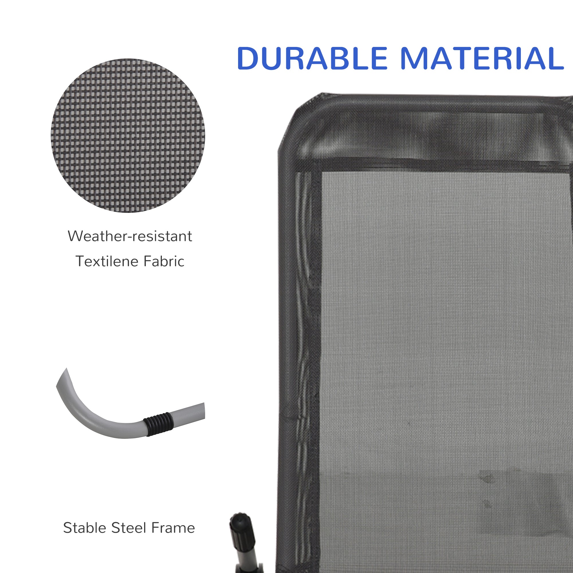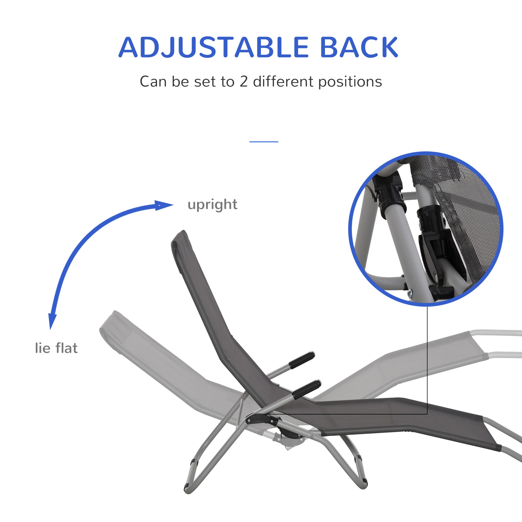 Let stress drift away with these sun loungers . Comes in a set of two - meaning you'll have space for a friend to relax with if ever wanted. The back can beset to 2 different positions - lie upright or flat. , making it comfortable for you. The weather-resistant texteline seat holds your body on the seat comfortably. When finished with this, you can fold it to carry and store it easily. Suitable for the garden, park, camping, festivals, sports matches and much, much more.