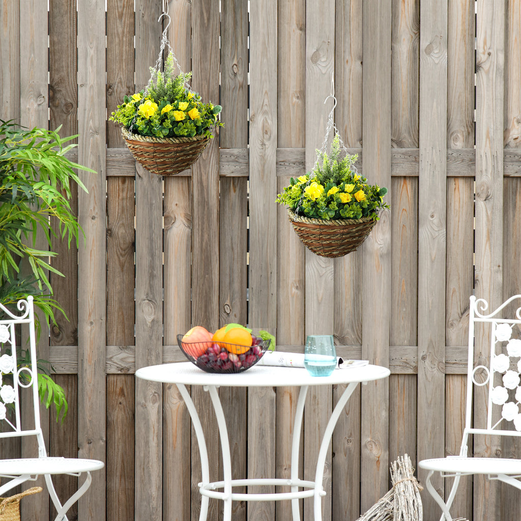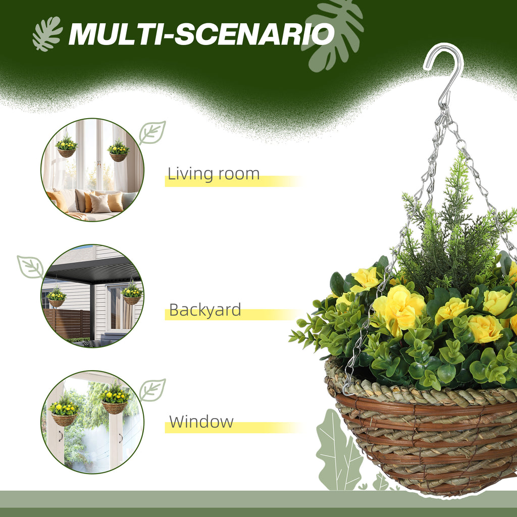 Dress up spaces in naturally colourful way, with no effort required-go for these artificial lisianthus flower pots. The fake plants come in a set of two so you can create a matching look easily. Made from top quality plastic for long-term use and a realistic look and feel, each pot features 18 faux flowers and 72 leaves, giving it a beautiful voluptuous look. These plastic plants come with a wicker pot and metal hook and chain, so you have everything you need in the package.