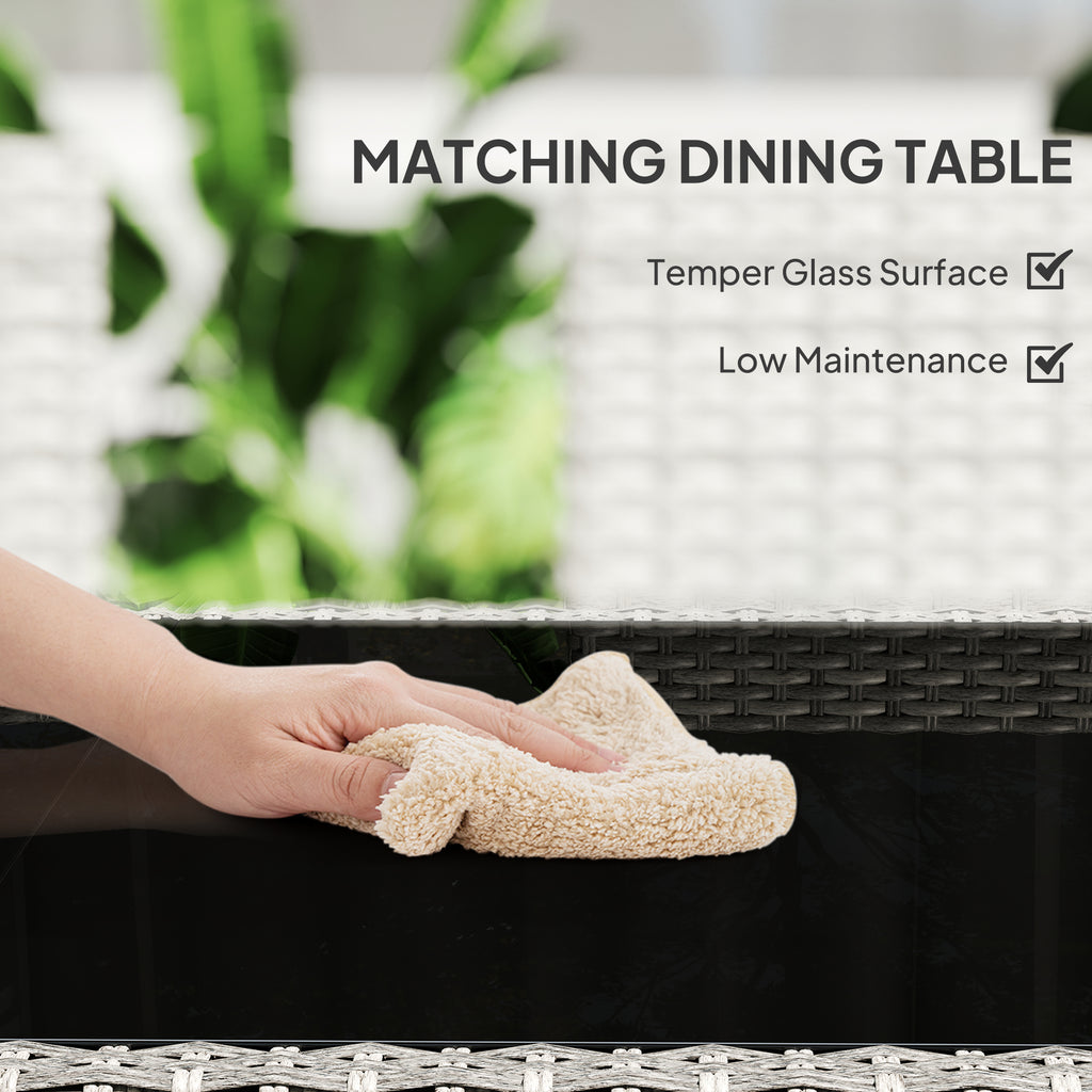 Comfortable and stylish dining with this seven-piece dining set. Comes with six chairs and a spacious table. Each piece has a steel frame for a strong core, wrapped in protective plastic wicker for a forever-stylish rattan look. Complete with padded seat cushions for comfort, with washable covers for hygiene.