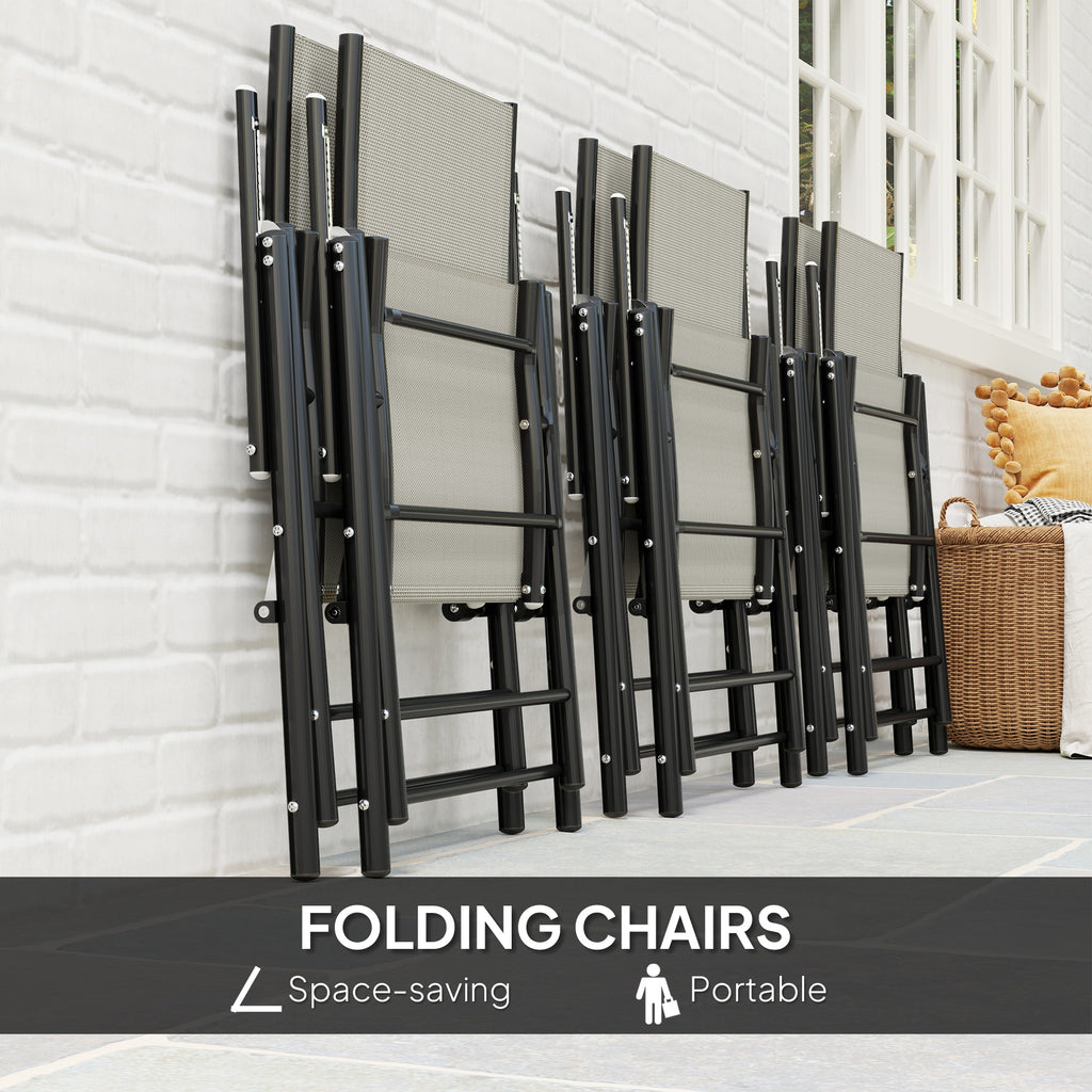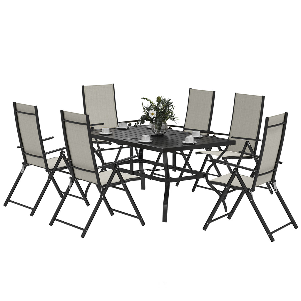 Simple, stylish outdoor dining with this outdoor dining table and chairs set. It comes with a rectangular dining table and six matching folding chairs: plenty of room for you and company. The powder coated galvanised steel frames mean the patio table and chairs are strong. The folding chairs save space and come with breathable texteline seats for comfort. This outdoor garden furniture set is complete with Φ50mm hole in the table to hold a parasol umbrella in place.