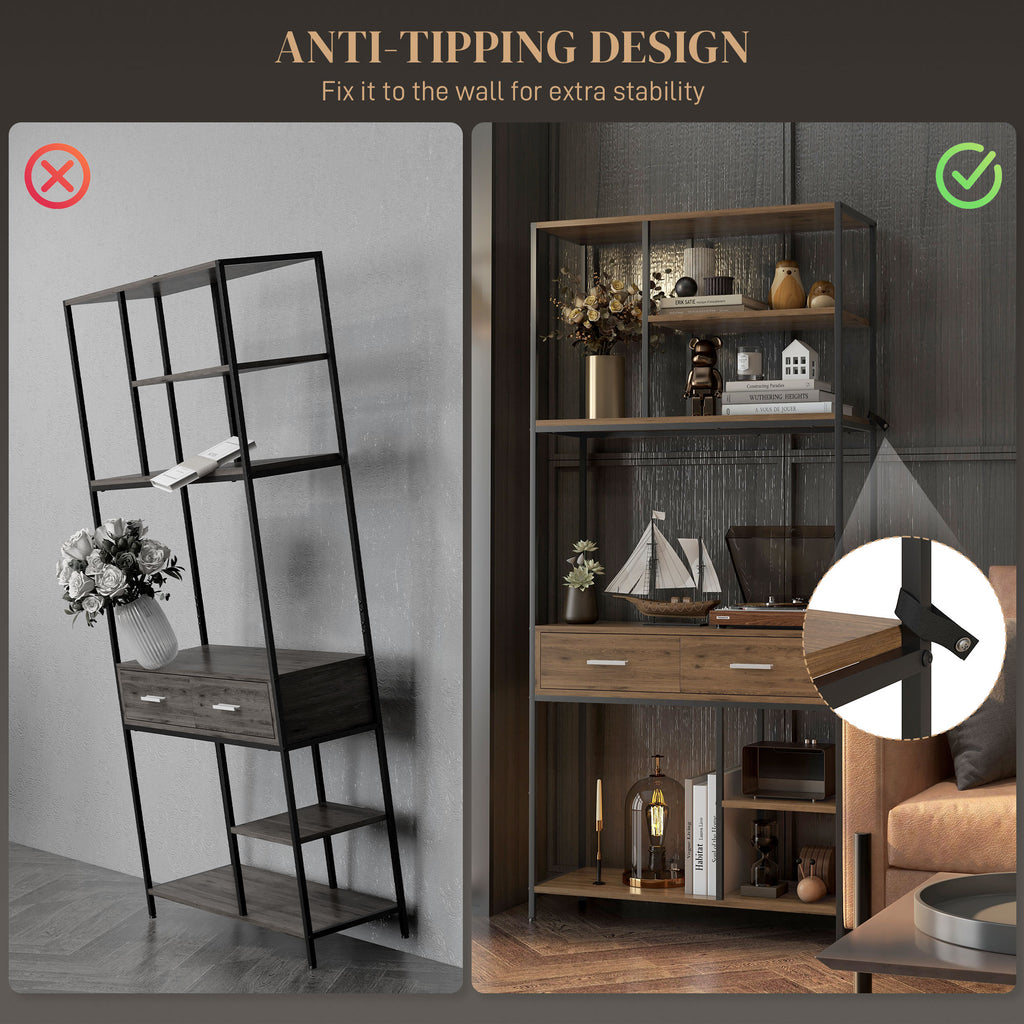 That gentle touch of character into your home, plus plenty of storage, with thanks to this shelving unit. With a black frame and wood-effect panels, this bookshelf adopts a cool industrial look - an eye-catching piece. It comes with seven mixed-size shelves, plus two drawers - a mixed of open display and hidden storage for plenty of different options. A powder coated metal frame for a strong core: attach the shelf unit to a wall with the anti-tipping straps for ultimate safety.