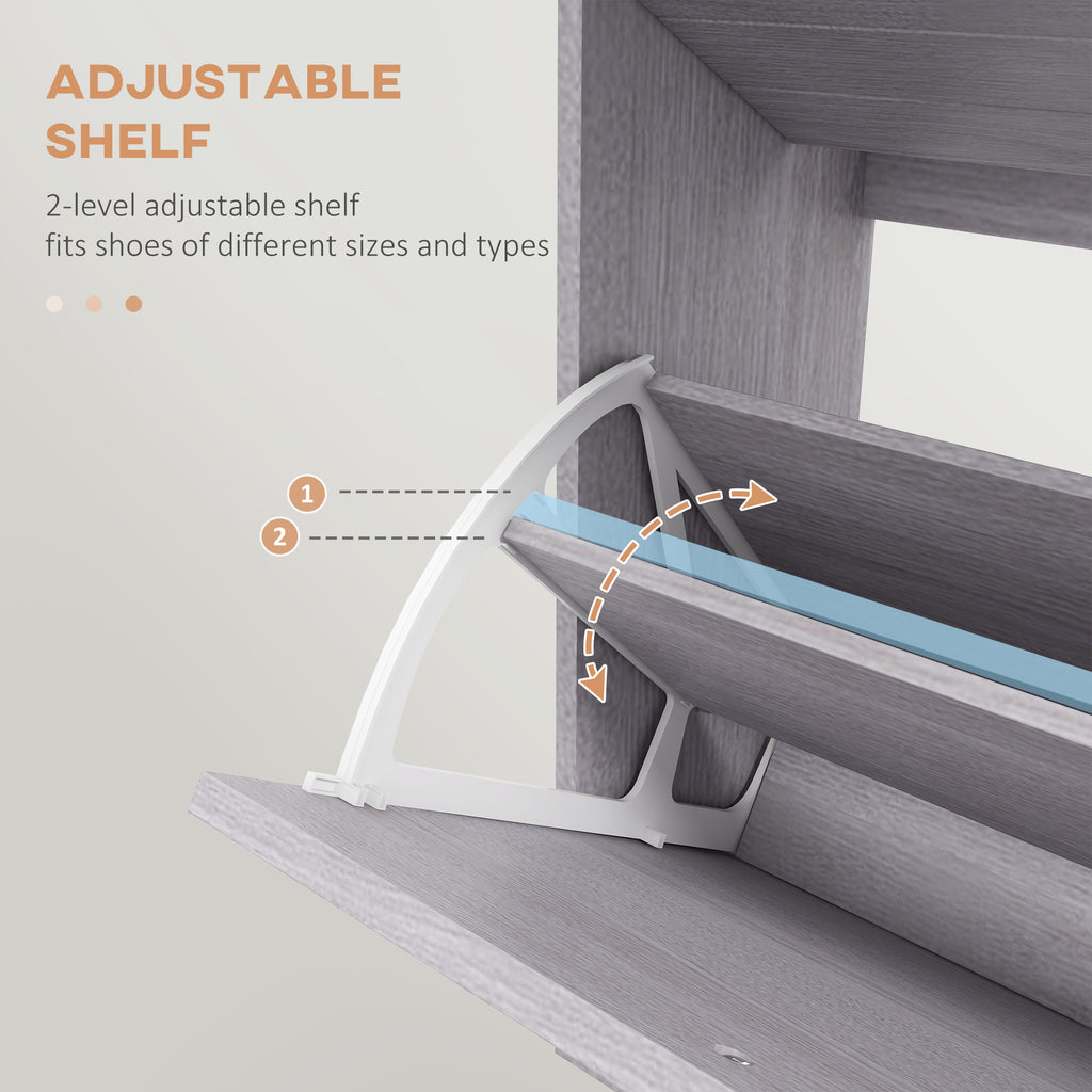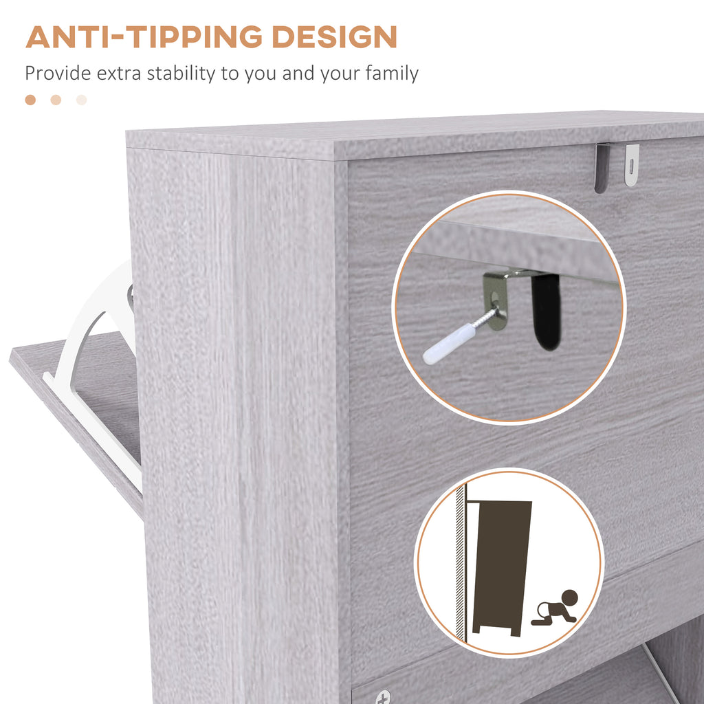 Made for the narrow spots, this slim shoe storage unit is here to keep the home clutter-free from shoes. Three flip drawers hold up to 12 shoe pairs - great for the household - or the individual shoe lover! Made from particle board, this shoe storage unit is sturdy and suitable for the everyday, with the paneled-door design giving it a modern look. Comes with anti-tipping straps to secure to a wall safety.