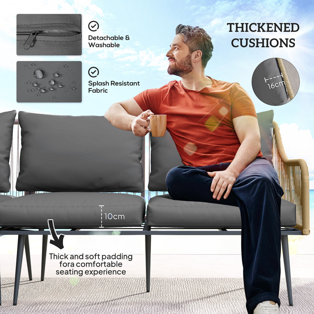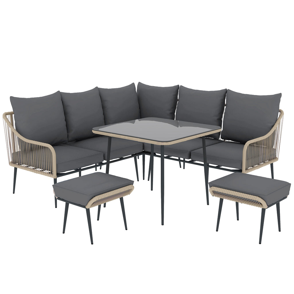 Simple and sleek, finished with total comfort - this garden sofa set ticks all the right boxes. The outdoor furniture set comes with six pieces: two loveseats, a corner chair, two footstools and a square table. Steel frames mean a strong core, with the rattan string panels adding a delicate style. The thickened padded cushions on the seats and back of this garden lounge set allow you to relax comfortably. The glass tabletop adds a sleek finishing touch.