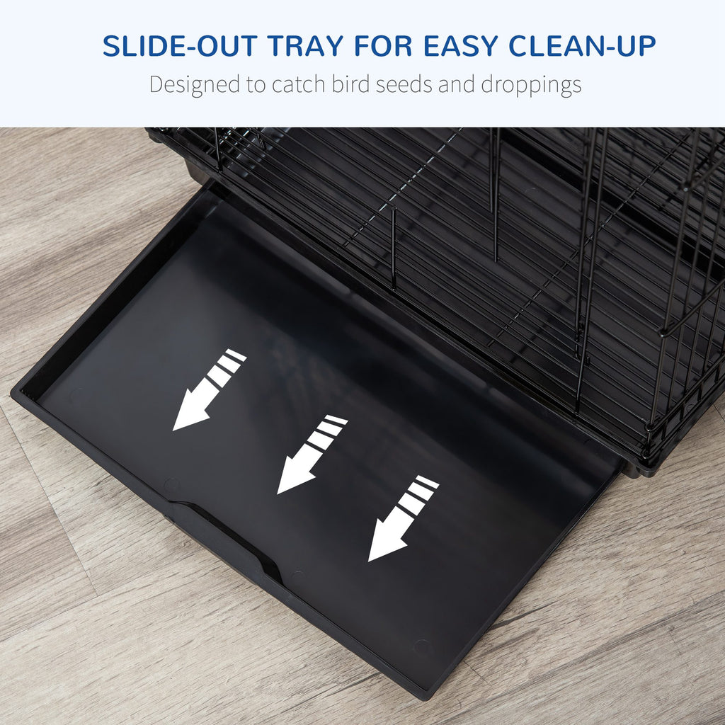 This finch cage features a rooftop perch that sits out of bounds from the cage walls, allowing your feathered friend the fun and freeing experience of being in the outside world. The design enables a bonding experience between you and your pet. With two top handles, this indoor bird cage from enables portability up and down stairs or to a desk or table you're sitting at, allowing them to stay close-by. The large doors of the cockatiel cage make it easy to reach in and access necessities.