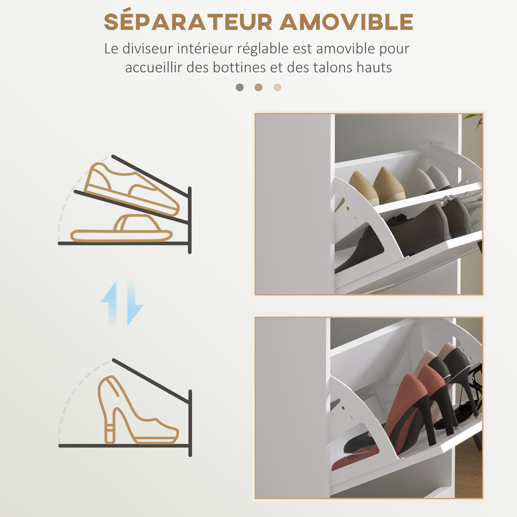 For even the smallest of spaces, welcome in this narrow shoe cabinet. With three flip drawers, it offers space for up to 15 shoe pairs. Each drawer comes with a two-level adjustable shelf to cater for different shoe sizes and types. Made from MDF this is a sturdy piece suitable for everyday use; this minimalistic white shoe cabinet comes with anti-tipping straps to securely attach to a wall.