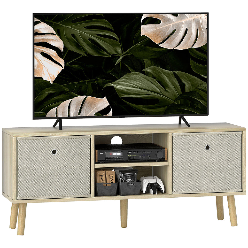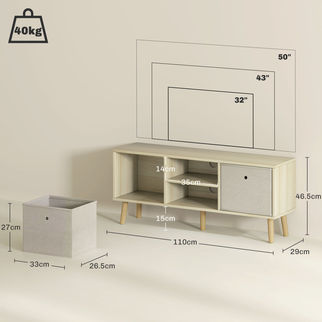 A new take on a TV unit or simple home storage - the choice is yours with unit. There are two shelves and two drawers - offering large amounts of space to keep the home tidy. Table top is large enough for a 50" TV or screen. Five wooden legs keeps it balanced and supported. And to double your storage? You can easily take out the fabric drawers.