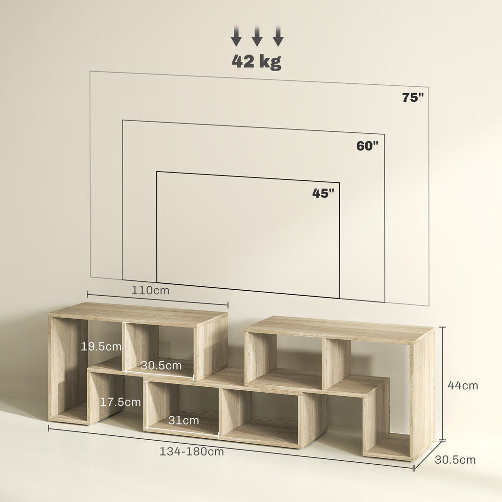 Discover the endless possibilities with the 3-piece TV unit with storage! This TV unit features adjustable combinations, with two L-shaped shelves that can be stacked, expanded, or rotated on the rectangular base to suit your needs. Use it as a low TV table stand, or standing display shelf. Its six compartments provide organized storage for electronics, books and ornaments. The solid shelves include foot pads for enhanced stability.