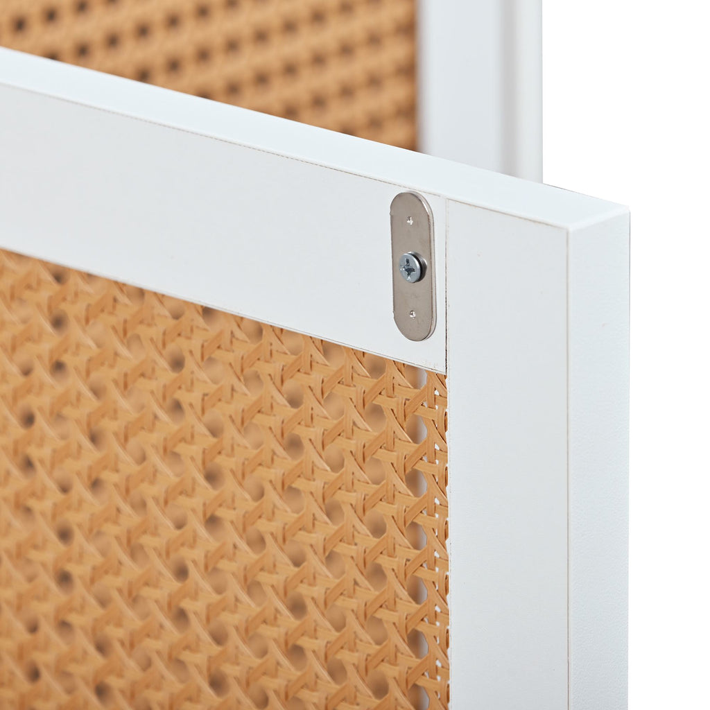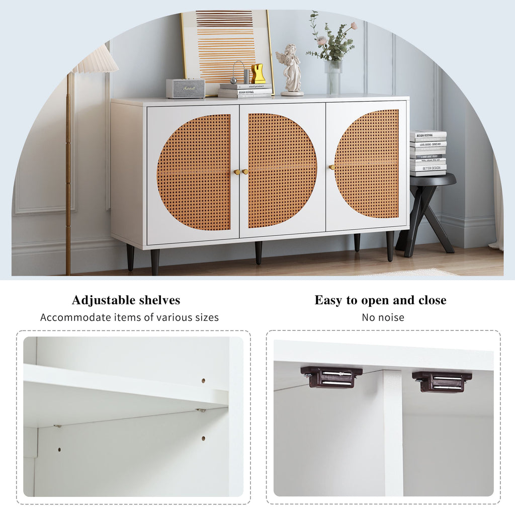 Enhance your living space with this elegant white sideboard, featuring three rattan-decorated doors and sleek metal handles. Perfect for the bedroom, living room, or office, it offers ample storage with adjustable shelves to suit your needs. Crafted from durable particle board, this piece combines style and functionality, while its 15 cm metal legs make cleaning underneath a breeze. Easy to assemble with clear instructions, this sideboard is a chic addition to any home.