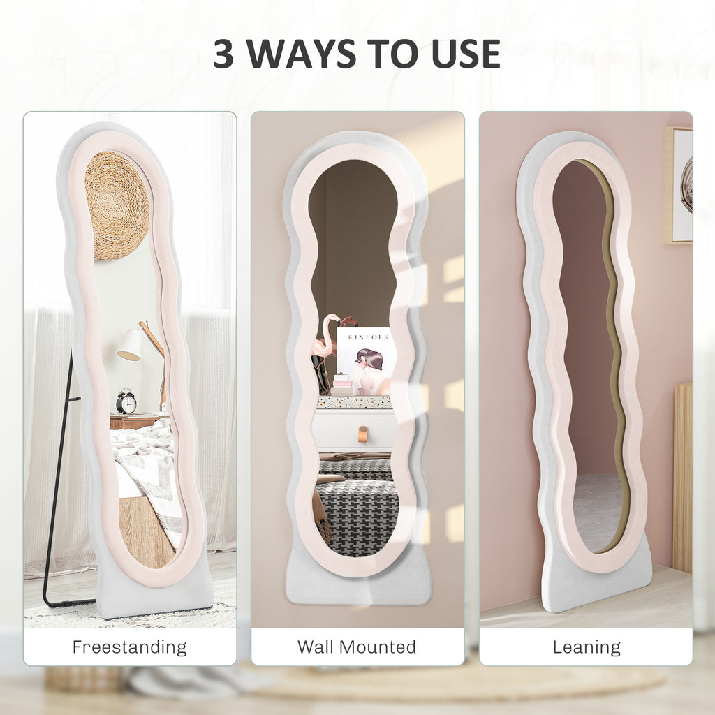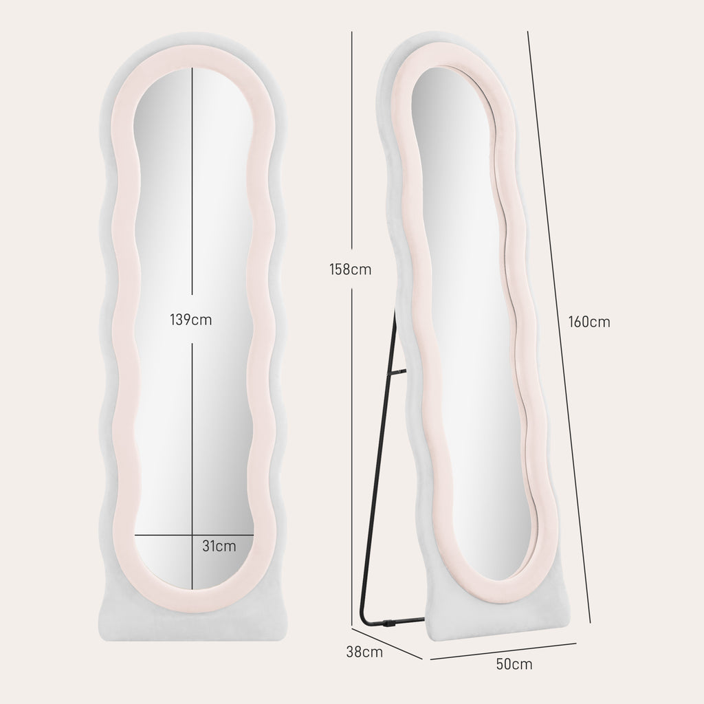 Fun and funky, this wavy mirror creates a statement in your home and beyond. The wavy shape, block colour and velvet-feel finish of the frame all work together to give it a bold, retro look; let the standing mirror work alongside your furniture, or give it a place which allows it stand out and command attention forever more. Thanks to the full length and thick glass, you can see yourself fully and clearly: you'll be leaving your home confidently forever more.