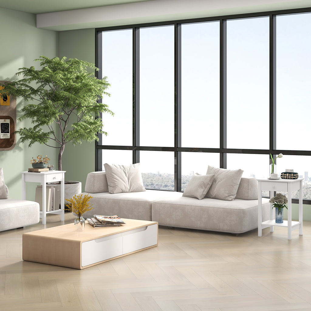 Bring elegance into your home décor with this sleek and stylish side table from Direct Home Furniture . In a fresh white finish, it features a spacious drawer with handle and a bottom shelf, making it perfect for storage and organisation in your bedroom, kitchen, living room or hallway. Crafted into a spacious, yet compact design, it is ideal for smaller areas of the home and its smooth surface allows it to be cleaned easy. A smart and fresh piece of furniture for every home.