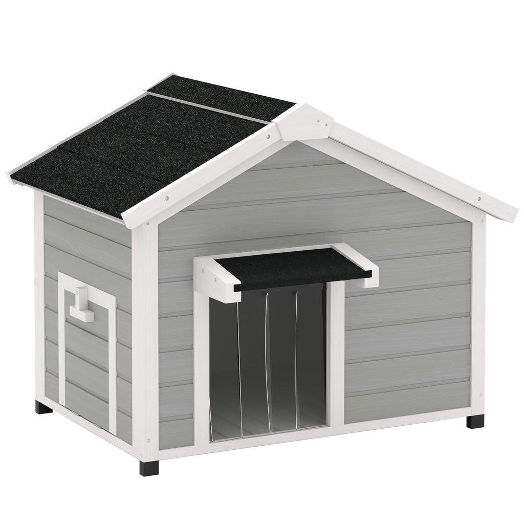 Discover the Dog House, where style meets functionality! Featuring an elevated design with plastic foot covers to protect from dampness and a sloped asphalt roof fit for all weather conditions. Complete with a cosy door curtain, this dog kennel outdoor is retreat for your furry friend, whether used as a cat house, indoor dog house, or outdoor dog kennel.